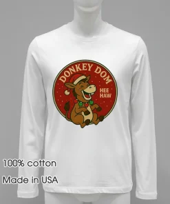 Just last week, my friend Sarah was stressing about her office’s annual “Festive Friday” contest. She’d seen that viral clip of Harry Styles rocking an ironically goofy holiday sweater last year, and even Olivia Rodrigo posted about wanting to elevate her Christmas party look beyond just plain red and green. Suddenly, everyone’s scrambling for unique, yet effortlessly cool, Christmas apparel. Sarah wanted something that wasn’t an ‘ugly sweater’ cliché, but still brought serious holiday cheer, a real ‘dopamine dressing’ moment to shake off the November chill. She’s always been a fan of quirky, vintage-inspired pieces that feel genuinely American, not mass-produced, and she’s big on comfort and sustainability—a huge trend right now, right? She spent hours scrolling, trying to find that perfect blend of funny, festive, and fashionable. She imagined herself at the office holiday potluck, or maybe even just doing her last-minute gift wrapping at home. She pictured her kids giggling when they saw it, or her dad asking, “Where on earth did you find that?” The goal was to spark joy without trying too hard, to embody that laid-back, yet spirited, American Christmas vibe. That’s when she stumbled upon the Donkey Dom Hee Haw Funny Christmas Shirt. The image instantly popped! It wasn’t just a donkey; it was Dom, and he was radiating pure, unadulterated holiday sass. It was exactly what she needed—a statement piece that was undeniably fun, a total conversation starter, and perfect for injecting some much-needed personality into the usual festive attire. It fit perfectly into the current fashion landscape where comfort meets bold individuality, where a simple graphic tee can be the centerpiece of a whole holiday look.
