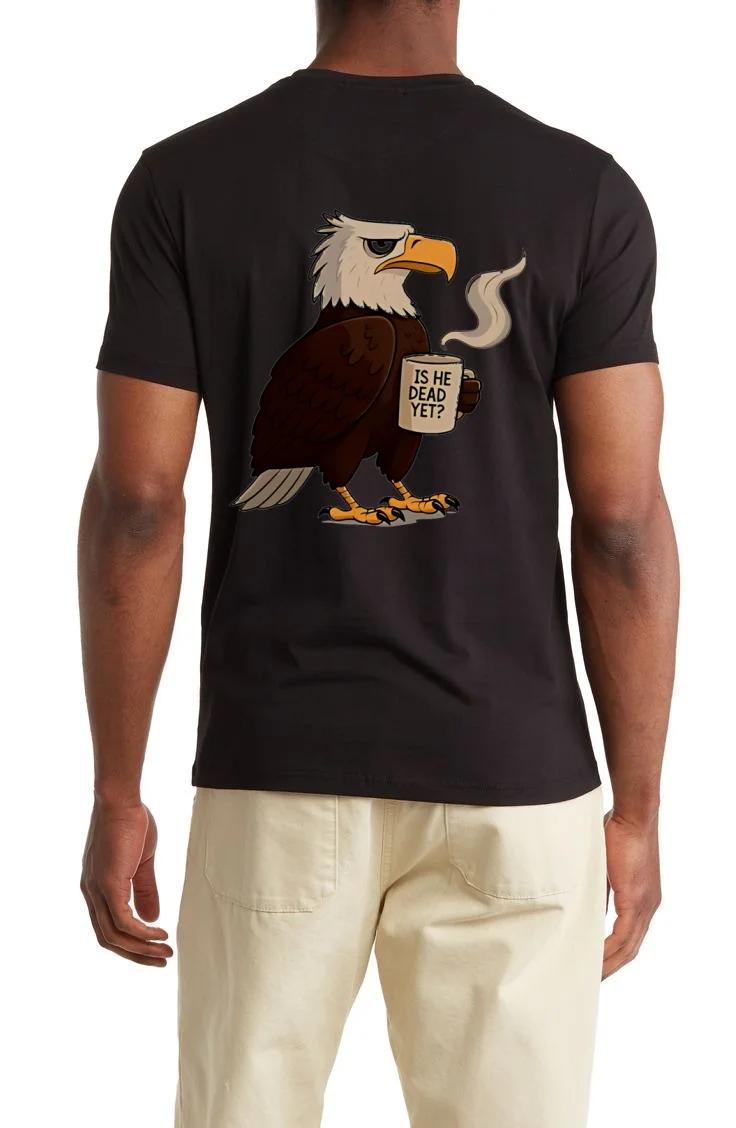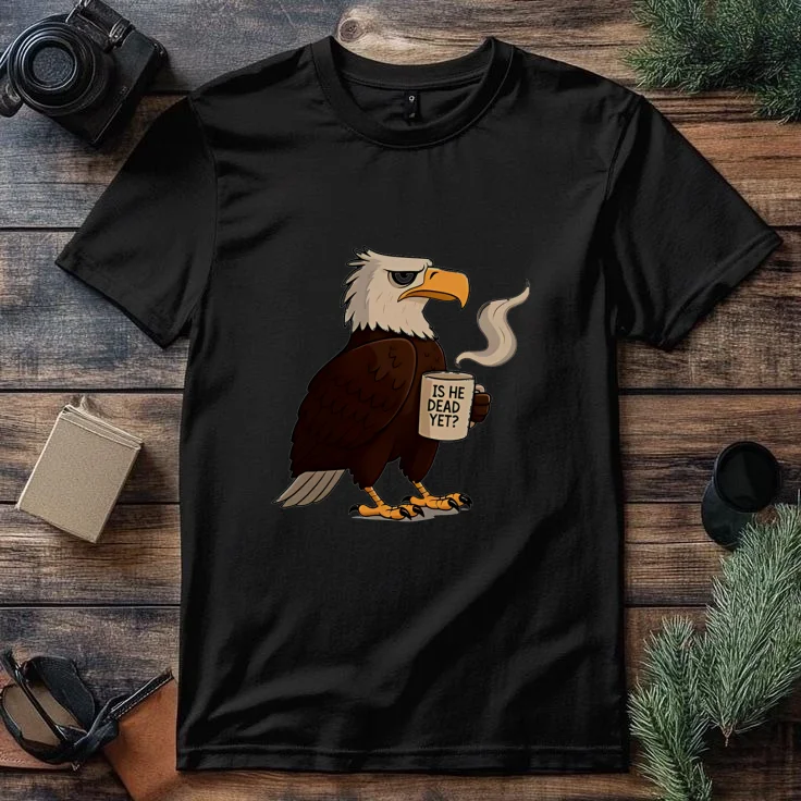 Let’s zoom in on that design for a moment, because it’s truly something special, isn’t it? The majestic eagle, that steaming coffee cup, and then that brilliant, slightly cheeky ‘Is He Dead Yet?’ caption – it’s just genius. This isn’t some bland graphic; it’s a piece of art that tells a story, sparks a laugh, and instantly makes you feel connected. It’s for those mornings when you absolutely need that first cup of coffee to even function, or for that friend who’s always, always asking for more caffeine. The advantage? You stand out! It’s a guaranteed conversation starter, which is just brilliant when you’re out and about. And the material, oh my gosh, it’s like wearing a cloud! Made from premium, super-soft cotton, it feels amazing against your skin, like your favorite worn-in tee right out of the box. It drapes beautifully, not too tight, not too baggy – just right. You can rock it with your favorite distressed denim for a classic casual look, layer it under a plaid flannel for that perfect autumn vibe, or even tie it at the waist over a flowy skirt for a touch of unexpected chic. It’s so versatile, you won’t believe it. Honestly, you’ll reach for this tee again and again. It’s just that good. Ready to add this gem to your wardrobe? Buy now and experience the comfort and style!