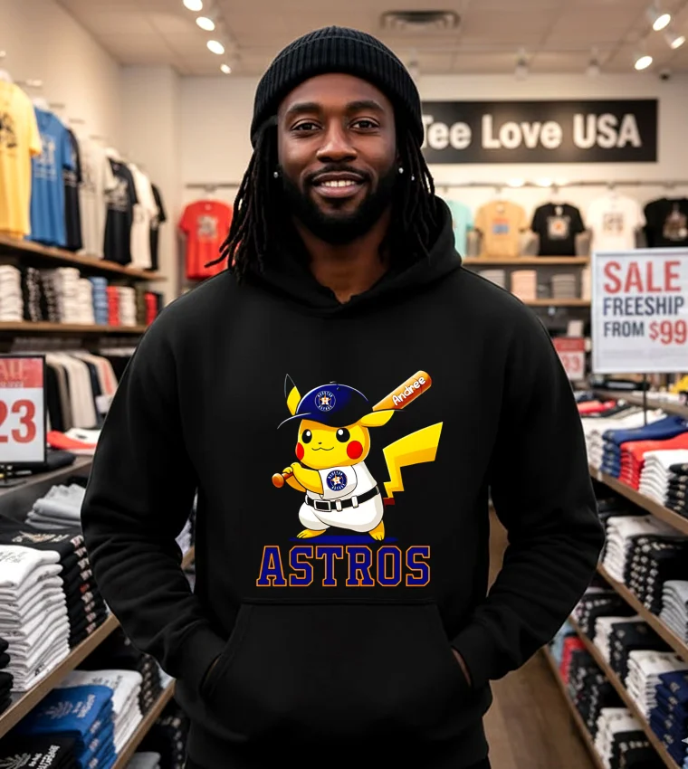 Okay, so it was like, the usual morning chaos—you know, scrambling for my keys, spilling coffee all over my already wrinkled shirt, phone buzzing incessantly with work emails and group chats, dodging a guy on a scooter who almost took out my leg, then overhearing this crazy gossip about Brenda from accounting and her new… ahem… mystery boyfriend. Anyway, I grabbed a granola bar, barely glancing at the weather forecast, which completely forgot to mention the surprise downpour that started just as I reached my car. And then, amidst the traffic madness and the drumming rain, I saw it: a flash of yellow and blue in a shop window – a quirky little store, actually, it was called Tee Love USA—and there it was, this amazing Houston Astros Pikachu Shirt. It completely changed my awful mood!