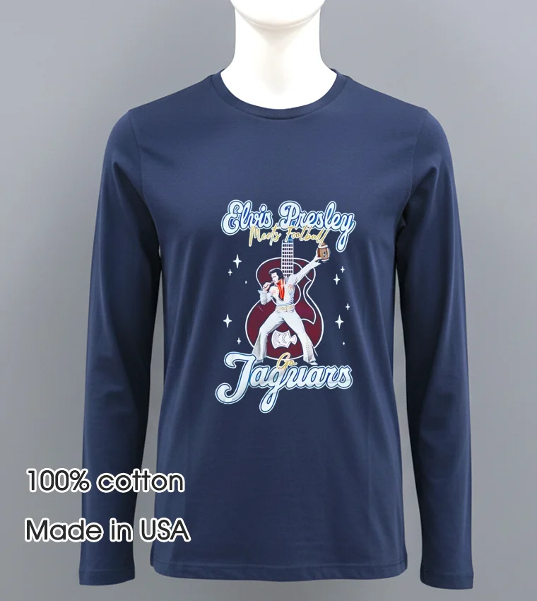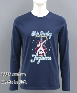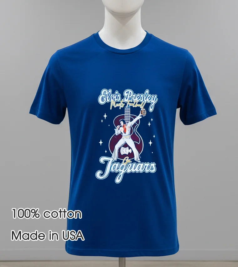 Let’s zero in on that captivating design, shall we? It’s not just two logos slapped together; it’s a harmonious fusion, often with Elvis in a dynamic pose, perhaps with a guitar, intertwined with the iconic Jaguars emblem. The blend just works, truly capturing both the energy of a touchdown and the raw magnetism of a rock star. The advantage? You’re not just wearing a shirt; you’re sparking conversations, showing off two passions at once. And the material? Made from 100% premium American Cotton, it feels incredible against your skin – soft, breathable, and just the right amount of stretch for all-day comfort. Pair it with ripped jeans for that classic American style, or throw it on with some cargo shorts and sneakers for an easygoing streetwear look. You could even layer it under an open flannel shirt when the weather gets a bit crisp. Honestly, you won’t believe how good it feels! Perfect gift for the dual-threat fan in your life, right?