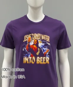 Remember when everyone started embracing “normcore” fashion, favoring comfort and authenticity over flashy trends? Or how about the recent surge in vintage revival, with 90s grunge and Y2K aesthetics dominating social feeds? Well, our Jesus Turned Water Into Beer Lightning Shirt perfectly blends that easy-going, comfort-first mentality with a hefty dose of personality – something sorely missed in some of today’s more muted streetwear scenes. Imagine this: You’re at the local brewery, enjoying a craft beer with friends, maybe watching a live band. The conversation drifts to absurd historical “what ifs,” and someone playfully says, “What if Jesus actually turned water into beer? That would’ve been a party!” Just then, you casually adjust your shirt, revealing the lightning-struck design that perfectly encapsulates that very thought. Suddenly, you’re not just wearing a tee; you’re sparking laughter, conversation, and maybe even a few high-fives. This isn’t just for church picnics, folks! It’s for game nights, weekend festivals, casual Fridays at a tech startup, or any moment you want to lighten the mood. It taps into that modern desire for clothing that acts as a conversation starter, a piece of wearable art that reflects a fun, irreverent side, much like the playful “anti-fashion” statements we’re seeing pop up in response to overly serious fashion weeks. It’s perfect for the person who values a good laugh and isn’t afraid to show it, fitting right into the athleisure-meets-expressive-graphics trend.
