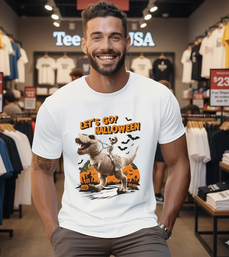 The sheer audacity of it all is what gets me. I mean, a mummy, a T-Rex, bats, and pumpkins? It’s not just a themed shirt; it’s a themed party all packed onto cotton. It’s a bizarre, delightful collision of Halloween iconography, completely unhinged and unapologetically itself. It reminds me a little of that time I tried to make a chili with every spice I owned – the result was… interesting, to say the least. But in the same way, this shirt embraces its chaotic nature, confidently flaunting its eclectic blend.