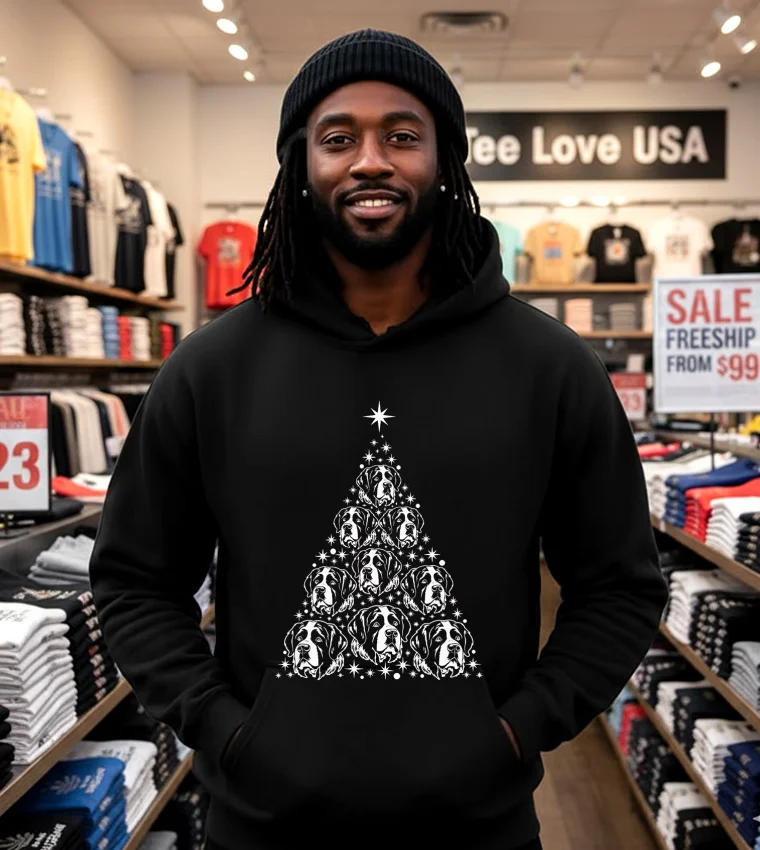 Let’s take a moment to really appreciate the star of the show here: that incredibly endearing Saint Bernard, with its gentle eyes and a tiny, perfectly decorated Christmas tree on its back. It’s not just a graphic; it’s a personality. This design isn’t loud; it’s a warm, comforting hug in T-shirt form, evoking memories of snowy days, warm fires, and the loyal companionship of a beloved pet. Wearing it isn’t just about looking good; it’s about feeling good, feeling proud of your festive spirit, and maybe, just maybe, showing off your love for gentle giants. It’s a conversation starter, a smile-inducer. To keep that charming design and the fabric feeling fresh, we suggest washing it inside out in cold water and tumble drying on low, or even better, air drying. Treat it well, and this shirt won’t just be a holiday item; it’ll be a treasured companion through many joyous seasons to come.